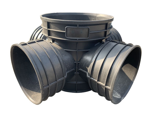塑料檢查井的井座部分大多采用的是一次性注塑成型,以異徑接頭、變角接頭和橡膠密封圈等配件來達到改變管徑及角度的連接。塑料檢查井配套開發了井蓋、井筒和相關配件,路面載荷通過井蓋、井座作用于檢查井周圍,避免了路面載荷對檢查井的破壞。井座具有上下浮動的功能,可主動適應路面的高低變化,同時井筒采用專用井筒,可根據現場埋設深度截取相應長度,靈活方便。井筒、進(出)水管道與井座的連接采用橡膠密封圈柔性承插式連接或者是熱收縮套連接,可適應小范圍內的角度變化,施工方便快捷,密封性能好、防滲漏,有效防止對地下水的二次污染,是一種環保節能建材。